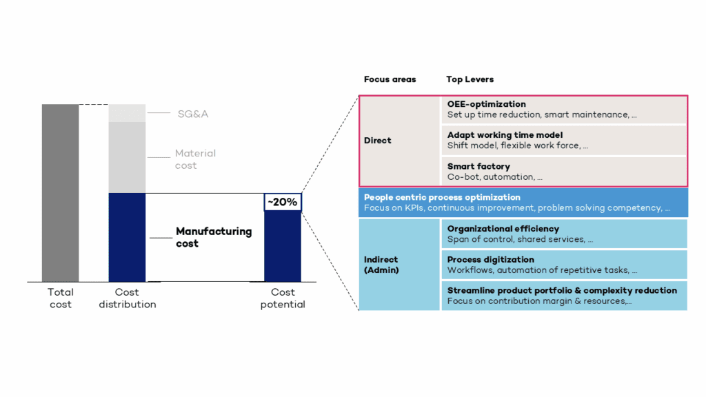 An dieser Stelle kommt die H&Z „Hebel-Datenbank“ mit über 1000 Verbesserungsansätzen zum Einsatz. Der Großteil der enthaltenen Hebel entfällt auf die Kategorie „Direkte Kostenreduktion“ und nutzt bewährte Maßnahmen zur Steigerung der Effizienz in direkten und indirekten Bereichen.