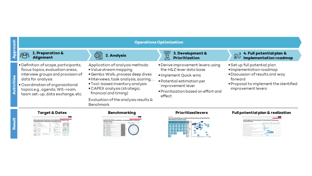 H&Z’s Operations Optimization is structured around a four-step process, meticulously crafted to ensure that each stage builds upon the last to maximize effectiveness.